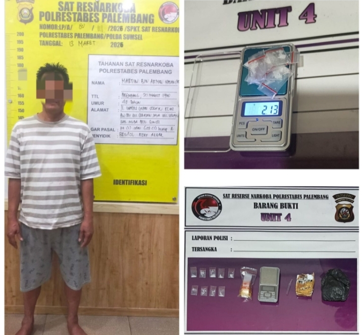 Unit IV Satuan Reserse Narkoba Polrestabes Palembang mengamankan tersangka M (48) di sebuah rumah di Jalan Pasundan, Lorong Slamet, Kelurahan Kalidoni, Jumat (13/3/2026) sekitar pukul 15.00 WIB.