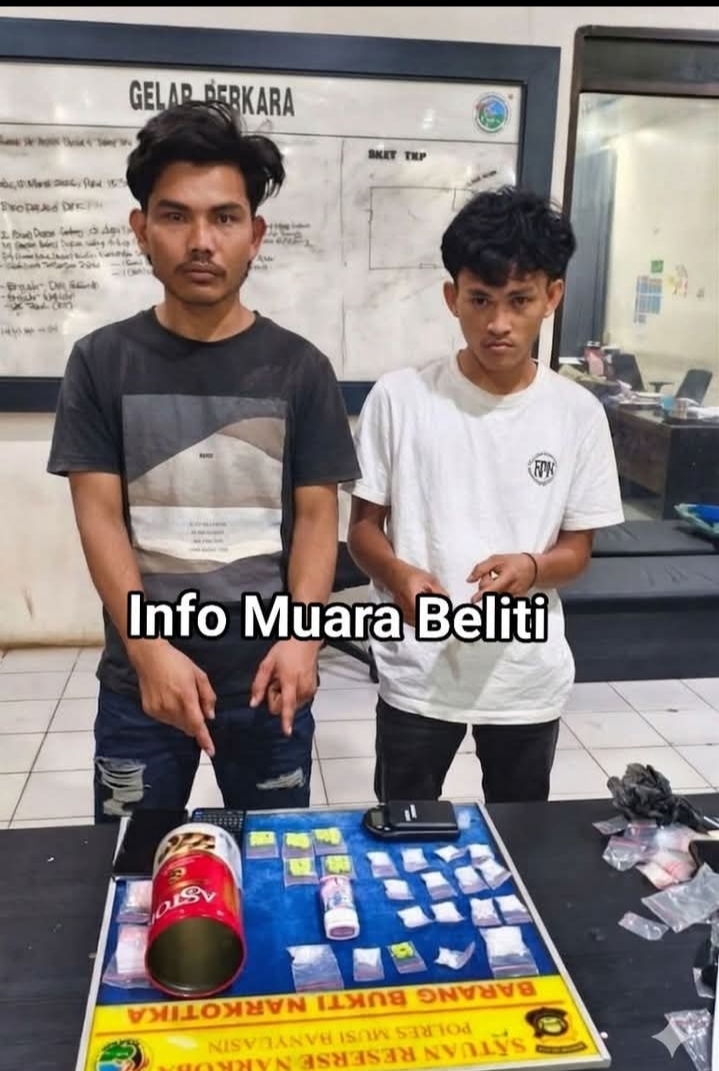 MUBA,-Cybermabespolri.com Info Muara Beliti – Tim Satresnarkoba Polres Musi Banyuasin (Muba) kembali mengacak-acak sarang peredaran barang haram. Kali ini, dua pemuda berinisial RP (28) dan A (23) tak berkutik saat rumahnya di Desa Pinang Banjar, Kecamatan Sungai Lilin, digerebek petugas pada Rabu siang (15/4).